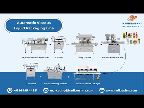Harikrushna Machines Pvt. Ltd. offers a state-of-the-art Complete Automatic Viscous Liquid Packaging Line for 10 ml to 2000 ml bottles/jars/containers with up to 300 products per minute output speed.