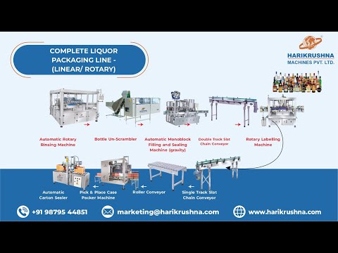Harikrushna Machines Pvt. Ltd. offers a state-of-the-art Complete Liquor Packaging Line - (Linear/ Rotary) for 180 ml to 1000 ml bottles with up to 250 bottles per minute output speed.